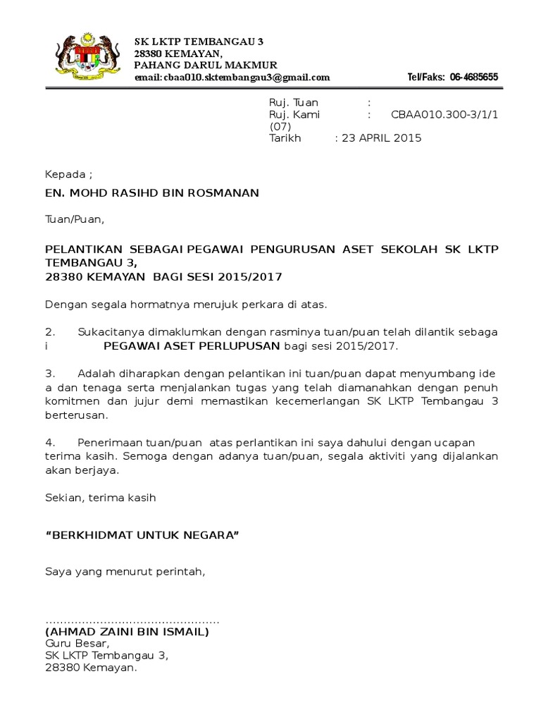 3semoga dengan pelantikan ini tuan dapat menjalankan tugas untuk meningkatkan prestasi perkhidmatan pendidikan. Contoh surat lantikan ajk masjid. Perkara di atas adalah dirujuk.